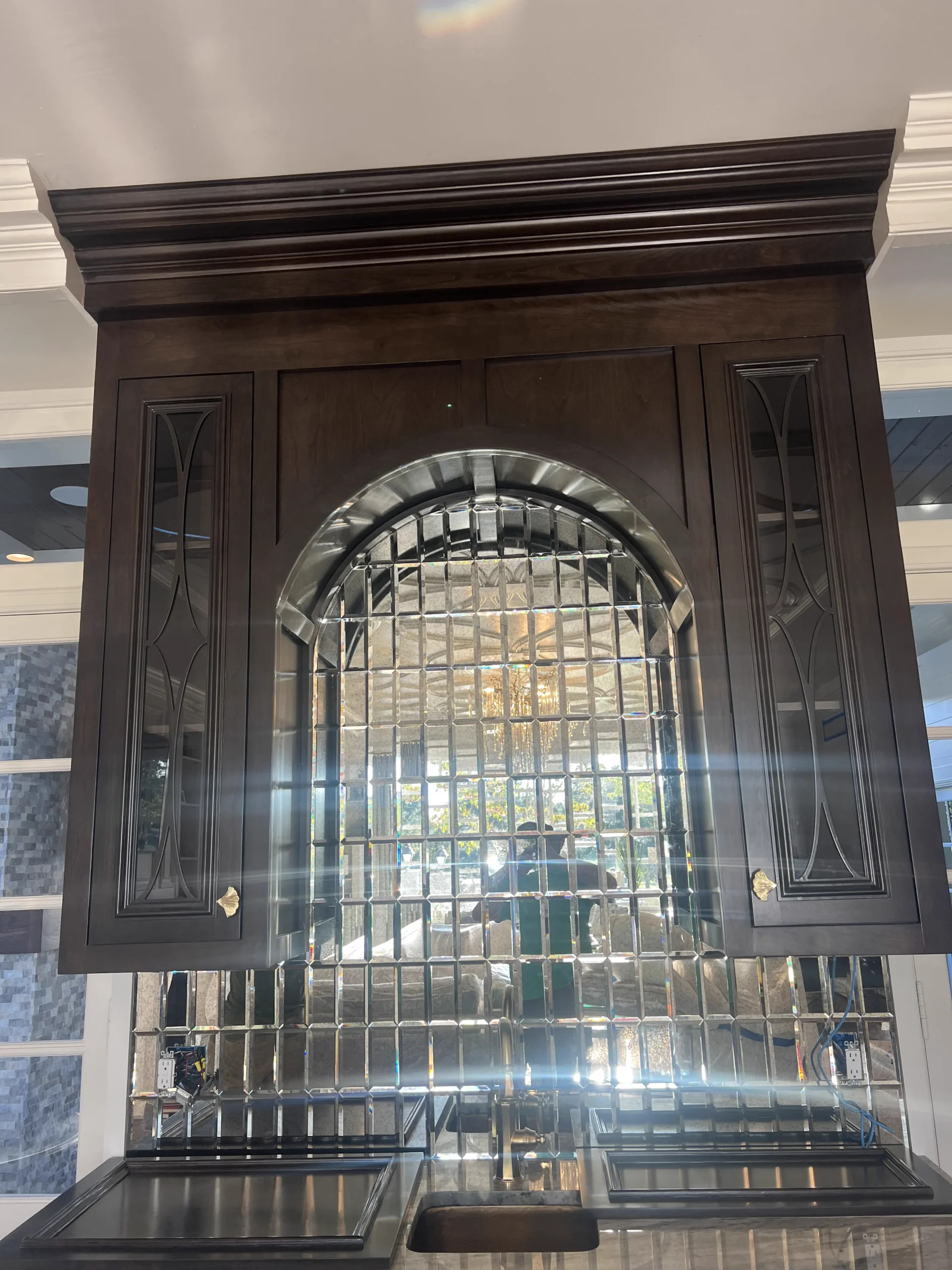 Built-in appliances were fully integrated into the cabinetry, maintaining clean lines and a cohesive look without sacrificing functionality. Behind it all, the mirrored tile backsplash adds depth and reflection, catching the light and truly making the entire piece pop.
